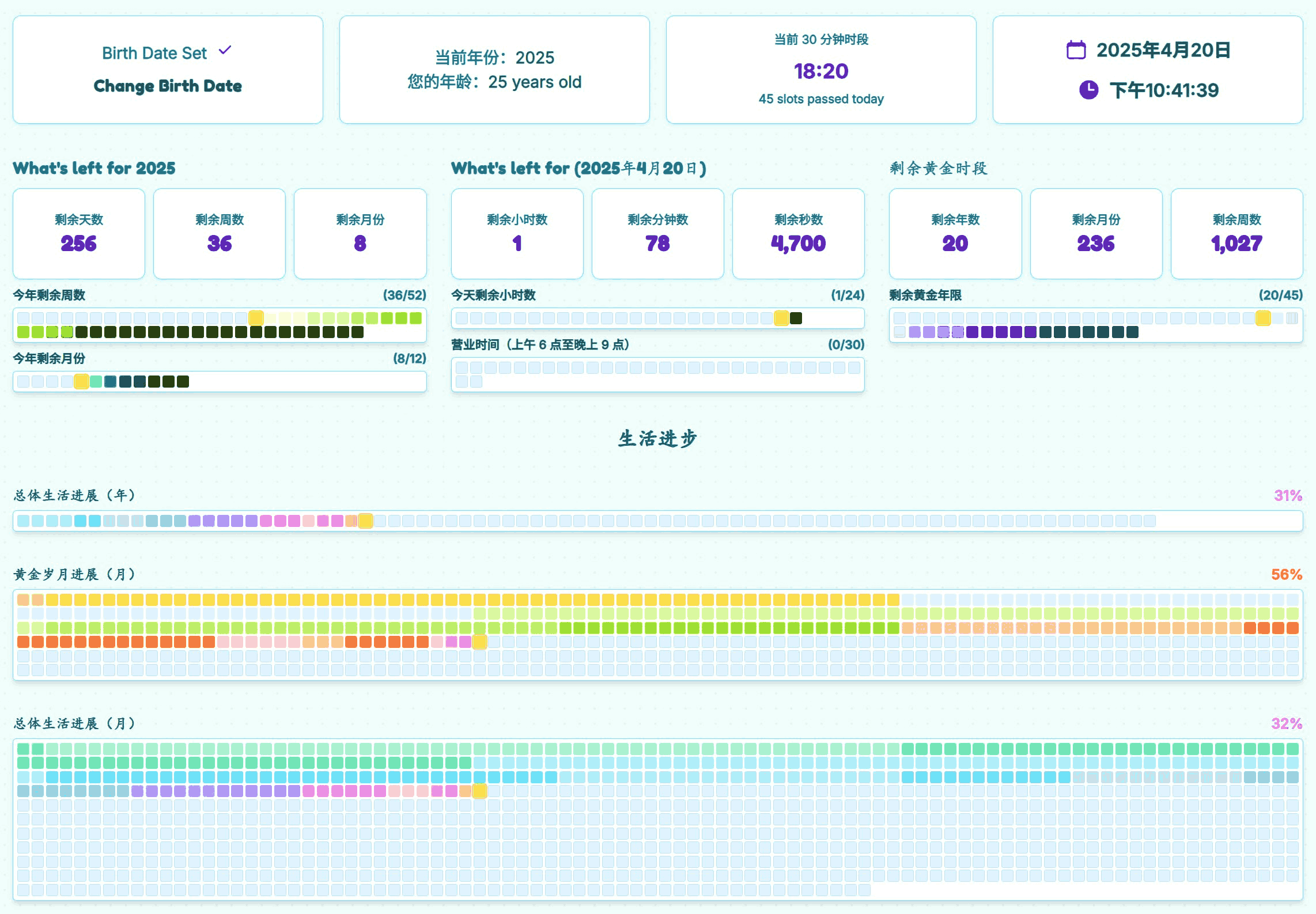 - 生命有限性提醒:通过可视化形式,直观地展示生命的有限性,帮助用户珍视当下。