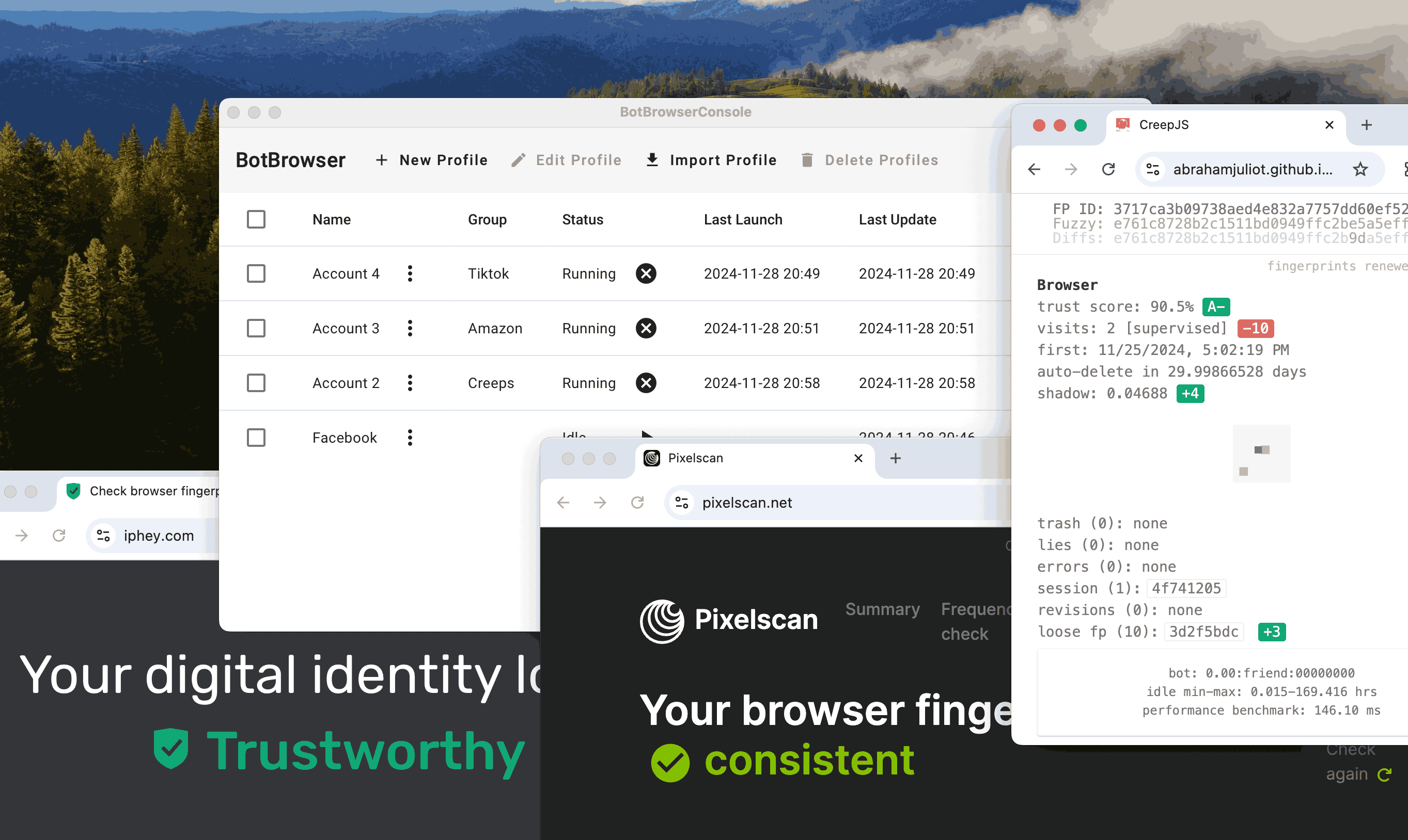 BotBrowser 是一款基于修改版 Chromium 核心的隐身浏览器,能够可靠绕过 Cloudflare、Shape、PerimeterX 等主流反爬虫检测,具备 98% + 的成功率,每天可注册超过 350,000 个账号。它支持跨平台兼容,Windows、macOS 和 Ubuntu 可无缝切换,并提供全面的指纹伪装功能,涵盖浏览器、图形、硬件、环境、媒体等多维度,为用户提供高效、稳定的自动化浏览解决方案。
