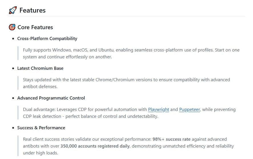 - 强大的自动化控制:支持通过 Playwright 和 Puppeteer 进行程序化控制,同时结合深层 C++ 修改,阻止 CDP 泄露检测,兼顾自动化与隐身性。