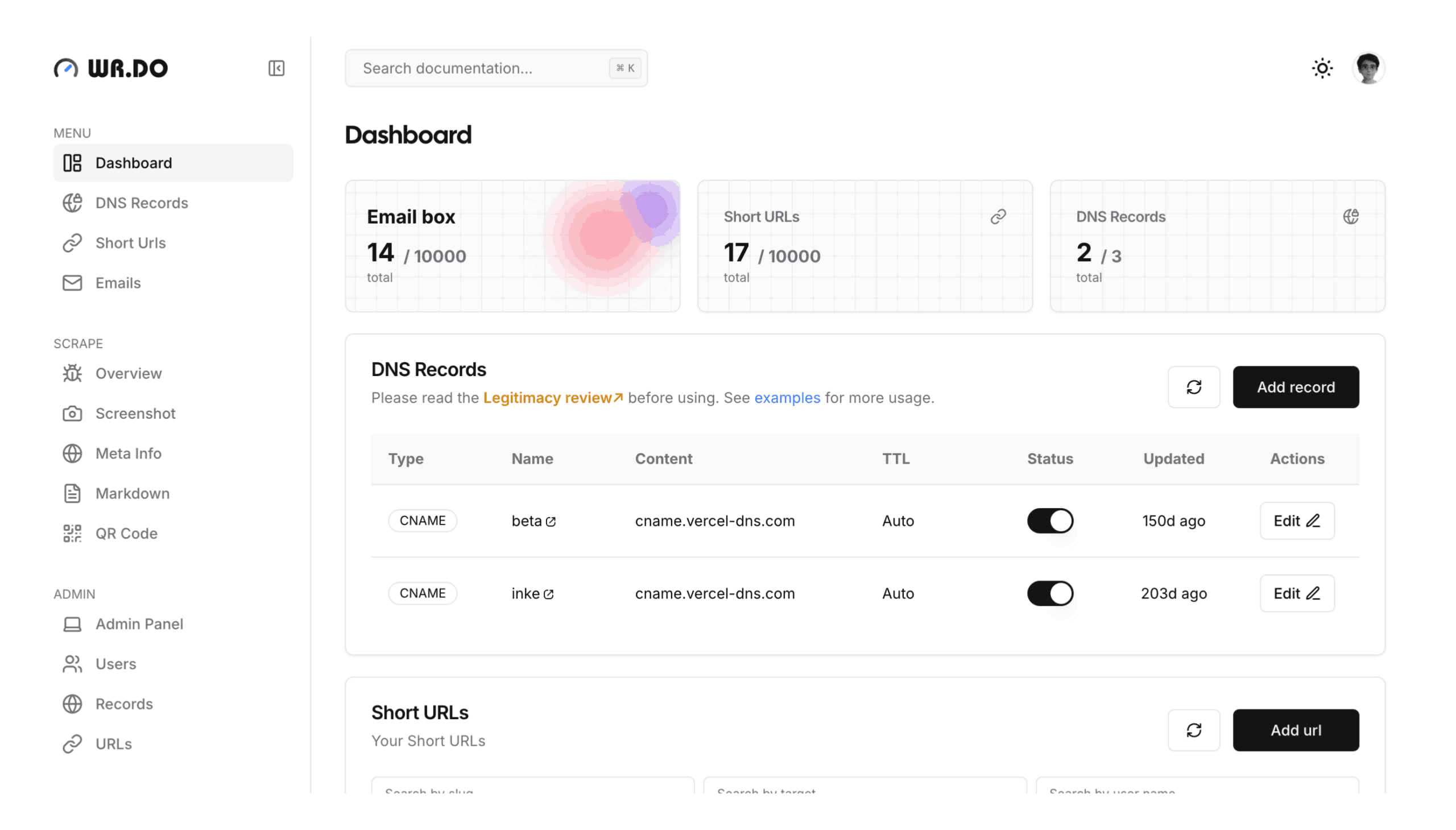 WR.DO:一站式域名服务平台,集成短链生成、临时邮箱、文件存储和子域名管理