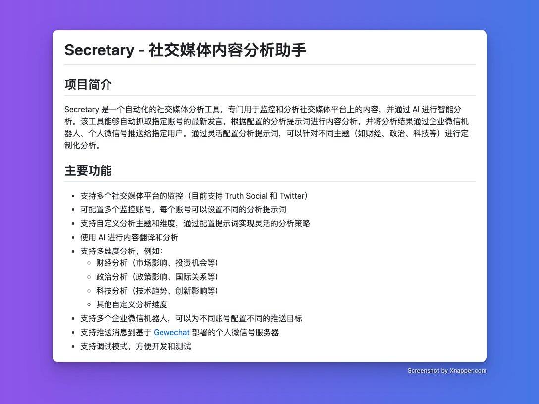 Secretary 是一款自动化的社交媒体分析工具,支持监控 Truth Social 和 Twitter 等多平台账号。它利用 AI 技术对指定账号的最新发言进行分析,并根据预设的提示词生成结构化的分析报告,支持将结果推送到企业微信、个人微信和 QQ 群等渠道,帮助用户高效获取和分析社交媒体内容