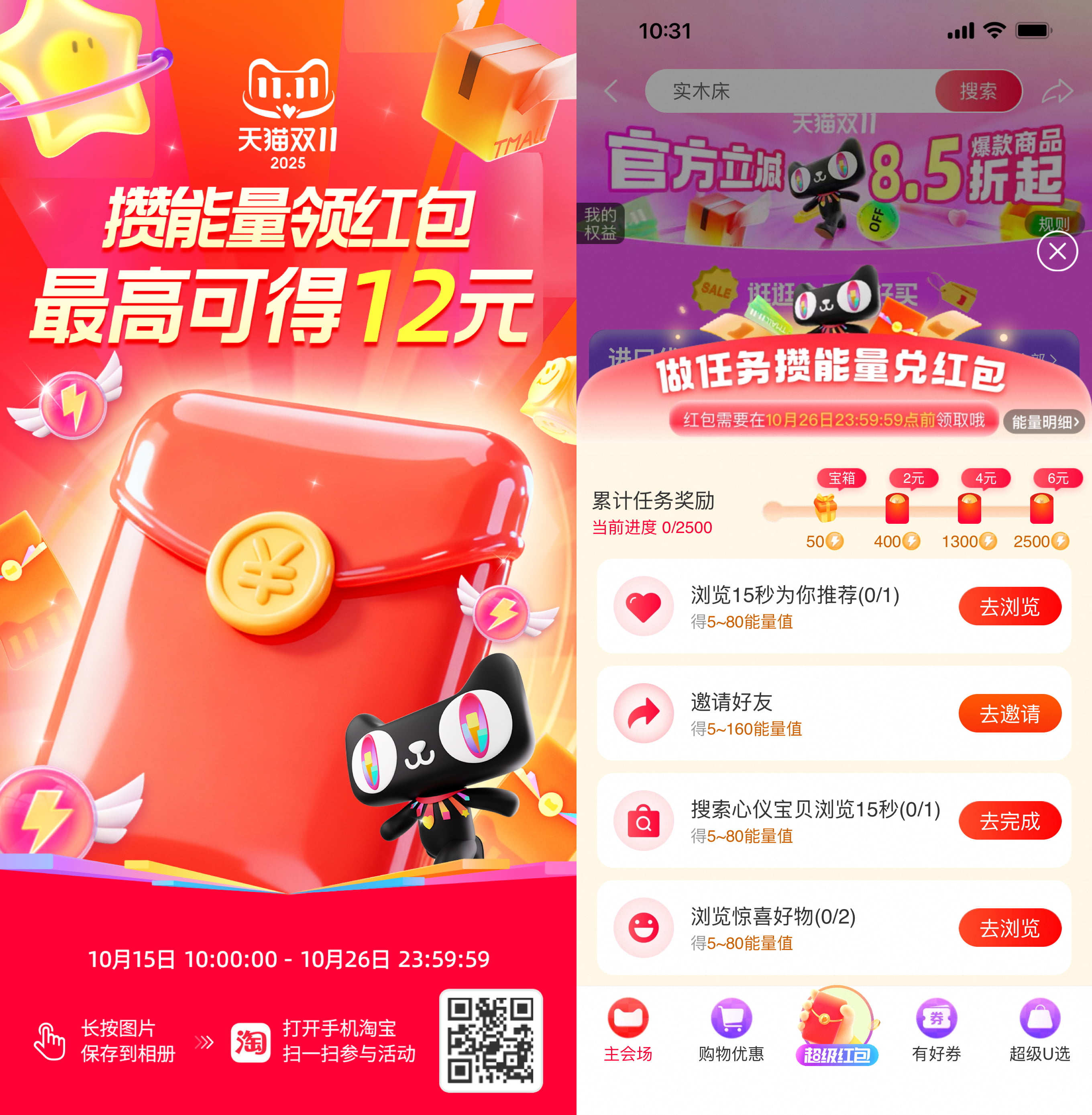 淘宝每天做简单任务得能量->50/400/1300/2500能量分别领取0.5/2/4/6亓无门槛购物红包