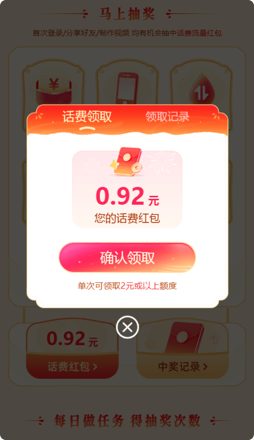 微信打开活动->有5次机会直接抽,基本啊都是2亓以上话费