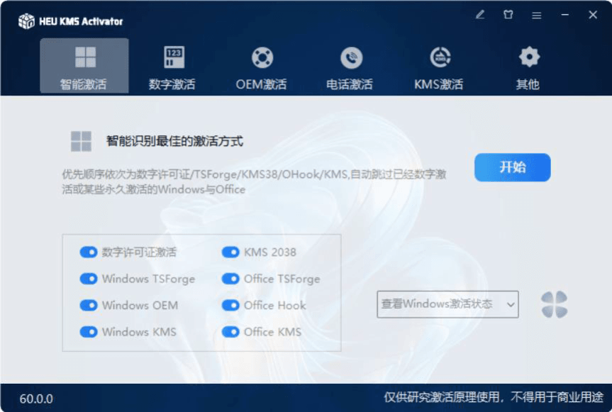 7、智能激活、激活成功率高、支持静默参数、几乎支持所有 Windows/Office 所有版本